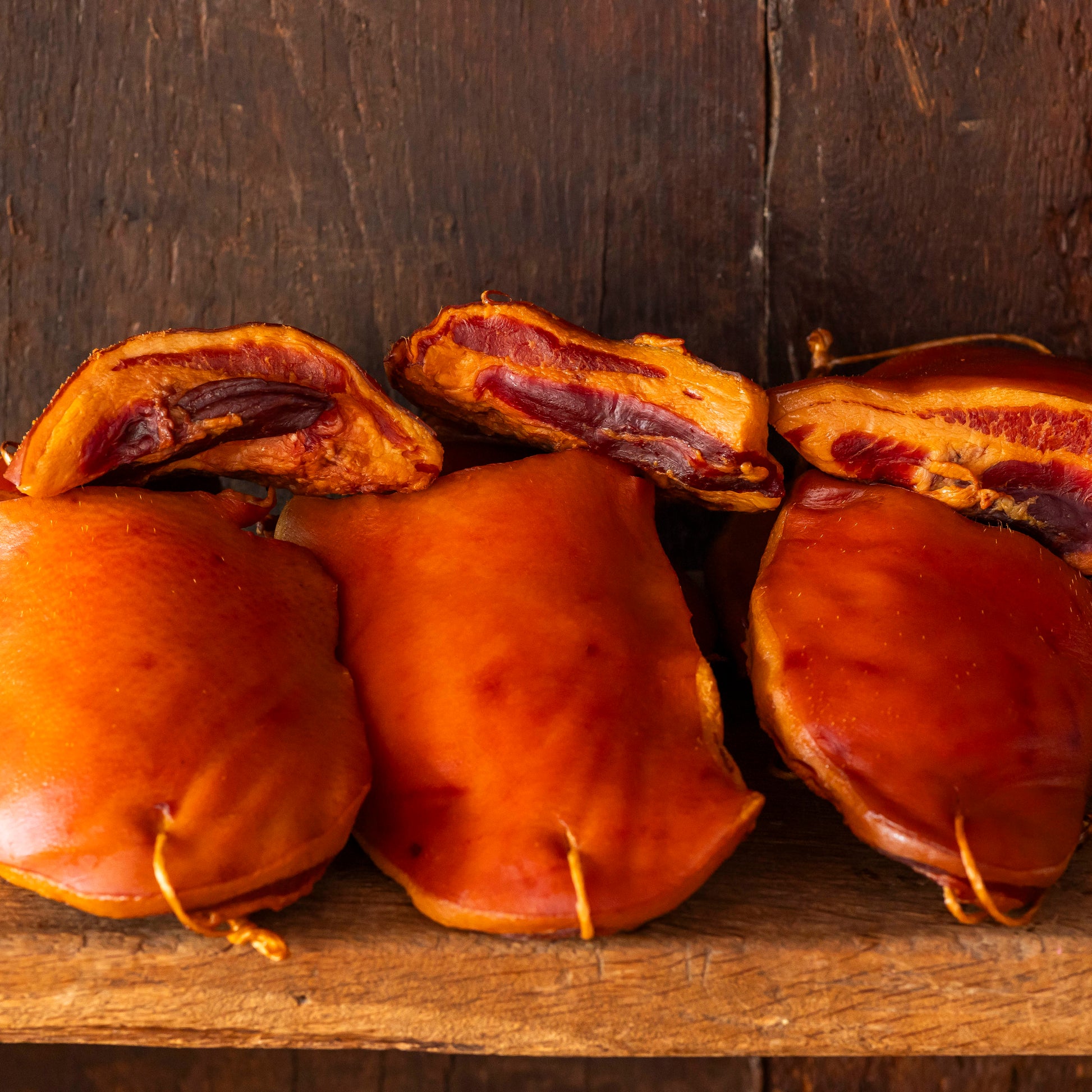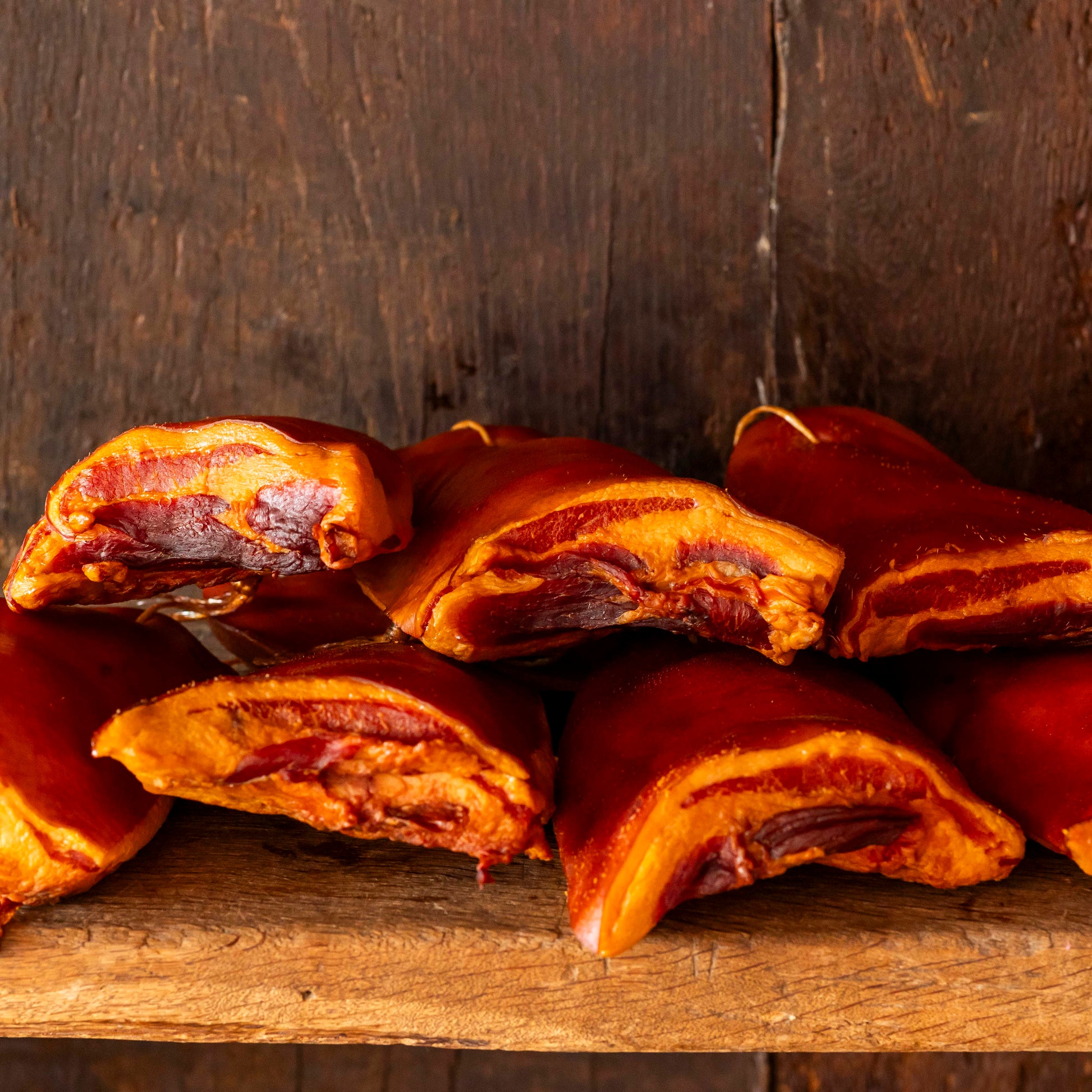 Traditionelle Herstellung, trocken gesalzen und anschließend langsam geräuchert.
